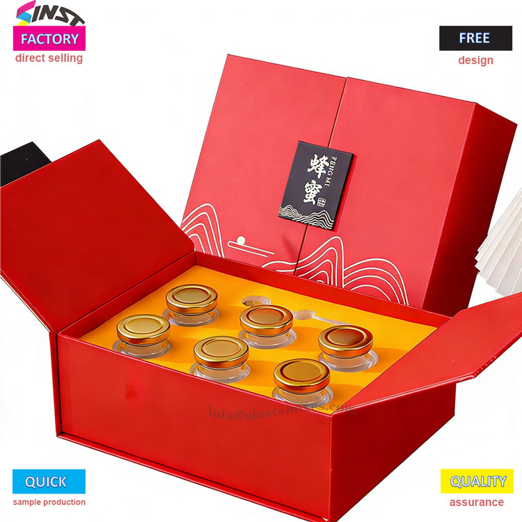 Оваа црвено златна кутија за подарок Honey, изградена во постава што апсорбира удари, може цврсто да ја фиксира стаклената тегла со мед и да избегне судири при транспорт. Кутијата за подароци од мед е погодна за сите прилики, вклучувајќи деловни посети, празнични подароци и сувенири и поддржува прилагодување на логото. Без разлика дали се работи за една лименка мед од висока класа или комбинација од повеќе лименки мед, може лесно да се носи, што го прави економичен избор за странските трговски трговци да ги зголемат премиите на производите.