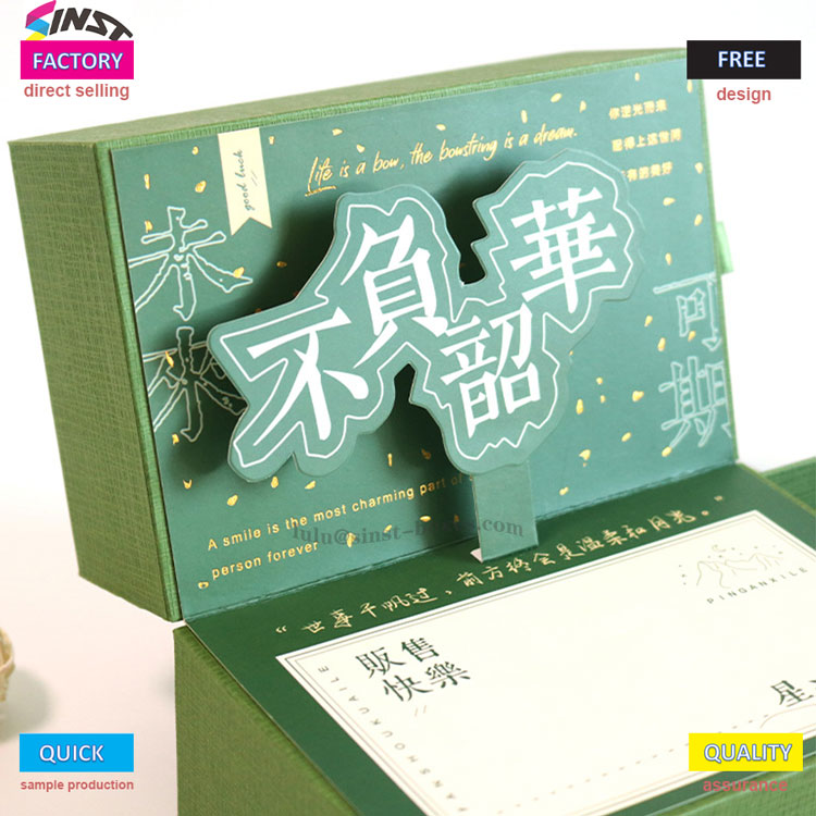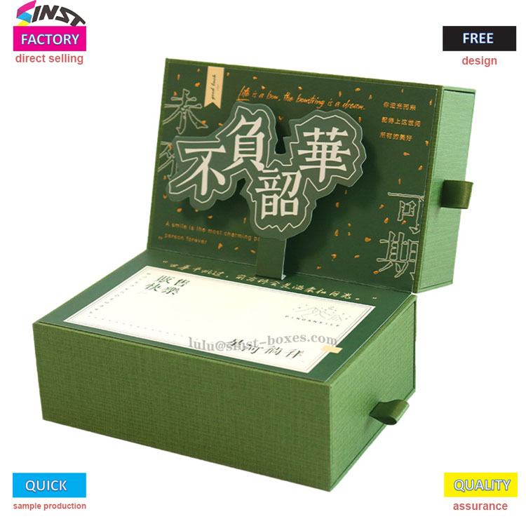 Оваа кутија за подарок за парфеми, која директно се продава со пакување и печатење на SINST, зема свежо зелено како главен тон. Кутијата од типот на фиока е опремена со тридимензионални уметнички ликови и златни украси. Страната на кутијата за подарок парфем е украсена со „Shao“ и „Qi“, а внатрешниот жлеб на перницата е стабилен и мирисна, покажувајќи деликатес. Соживотот на уметничката смисла и ритуалната смисла е квалитетниот избор за пренесување на емоциите.