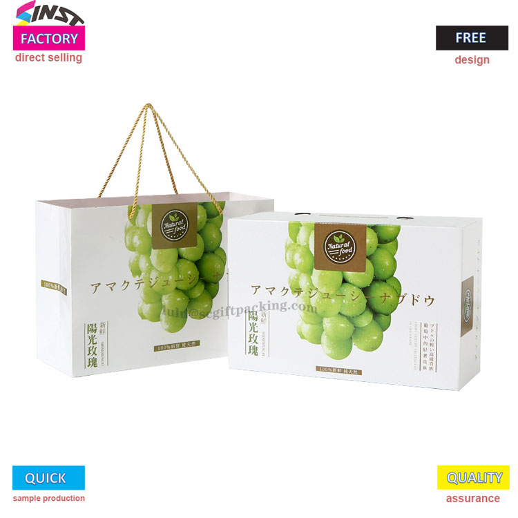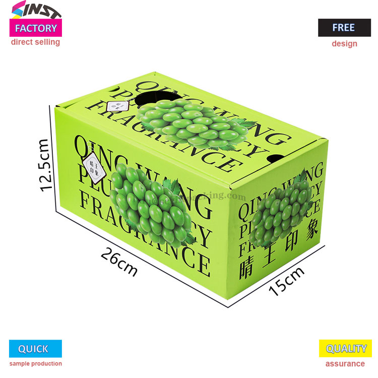 Овошјето Универзална рачна кутија за подароци за грозје е изработено од засилен е-коругиран картонски материјал, со светла шема на грозје, отпечатена на површината. Тој е спарен со зелена лента за носење на врвот и логото на брендот отпечатено на телото на кутијата, јасно ја пренесува нашата основна филозофија на услуги - нема потреба од посредници да направат разлики во цените, а целиот процес од селекција до масовно производство го управува фабриката.