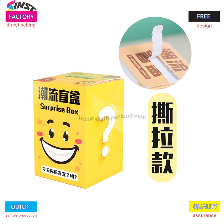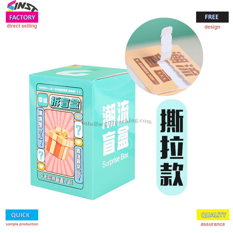Во постојано развивачкиот свет на колекционери, новиот тренд го зафати целата индустрија за играчки. За разлика од сложената пакување на традиционалните слепи кутии,оваа кутија за картичкиСерија усвојува удобен дизајн на „Солза и отворена“. Надворешната кутија е отпечатена со цртана слика Q-верзија, а симпатичниот предмет скриен внатре може да се открие во моментот на кинење, правејќи го процесот на небогање полн со опуштена церемонија, што го сакаат младите Божји луѓе. Овие шармантни изненадувања на играчки ја комбинираат возбудата на небогање со возбуда од откривање на играчките внатре, правејќи ги луѓето да ги сакаат неизмерно;
