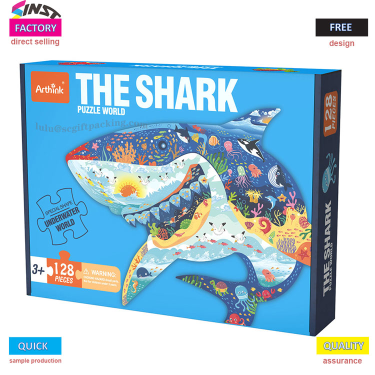 Минатата недела го запознав Џанг Жи во изложбениот салон. Ја држеше ајкулатакутија за подароци за загаткитаа штотуку прими и радосно извика: „Моето дете ја отвори и извика: „Мамо, види! Забите на голема ајкула ќе светат!““ Гледајќи во насоката што ја покажа, ајкулата на сината кутија за подарок беше покриена со мали рибини корали по целото тело, а откако склопи 128 парчиња сложувалка, изгледаше како „ова е наш фрлач. SHARK PAZZLE WORLD, што е и шарената кутија за подарок од вонземјани на сликата.