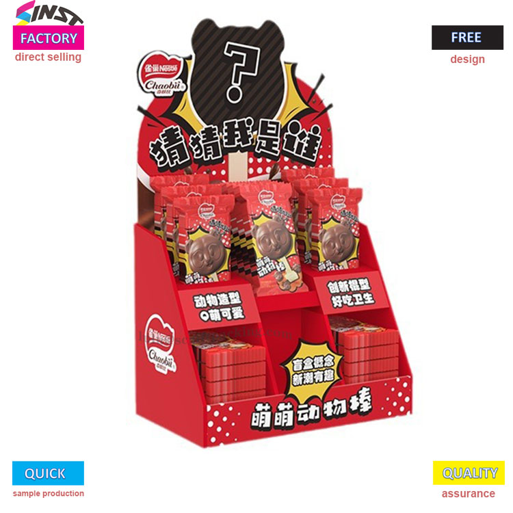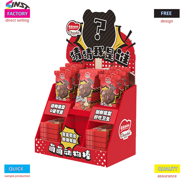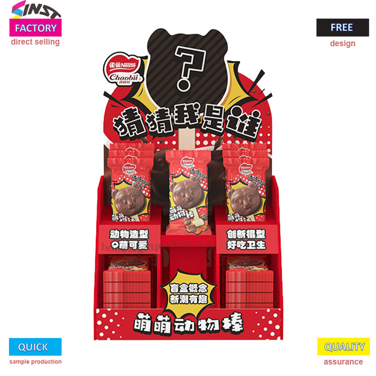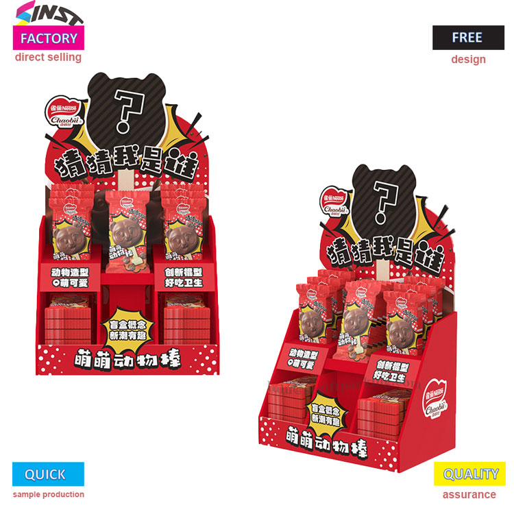 Оваа кутија за прикажување на картон за Snack Candack PDQ има светло црвена шема на бои и симпатичен и разигран дизајн. Во кутијата се прикажани закуски во форма на црвено животно (печатено со симпатични модели на миленичиња) во повеќе слоеви, со фокус на „Animalивотински облик Q симпатична“, „Иновативен тип на храна вкусна и хигиенска“ и „Трендовски концепт на слепи кутии“. Точно привлекува семејства кои сакаат миленичиња и е забавна алатка за маркетинг за привлечни терминални дисплеи.