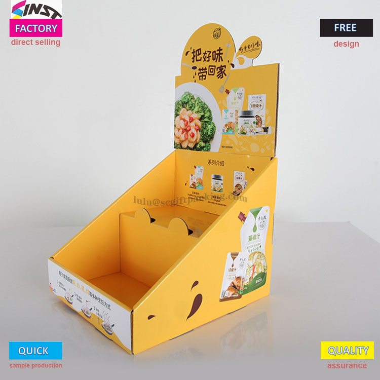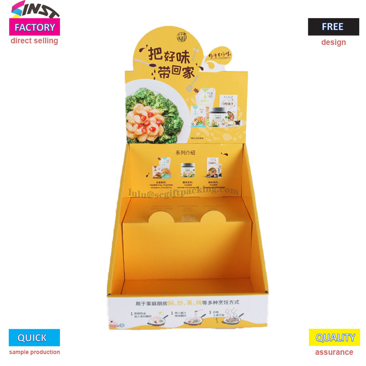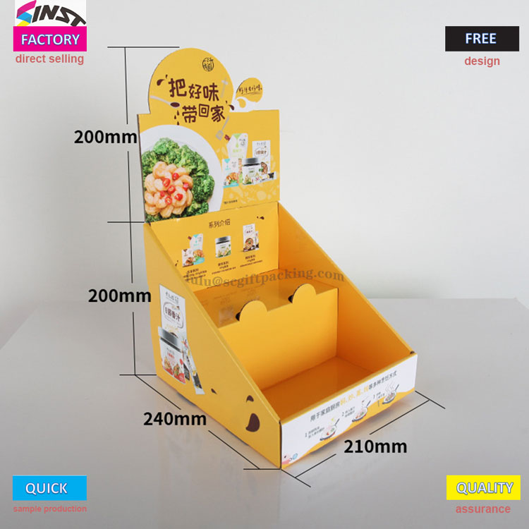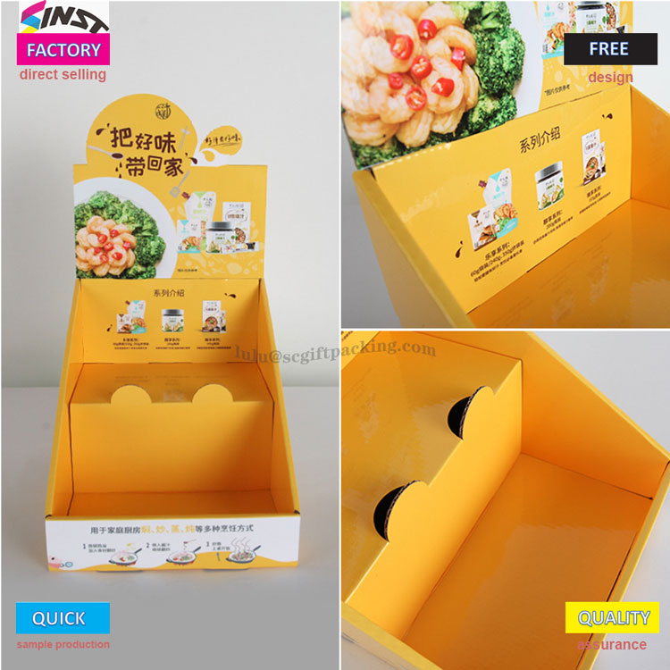 Ова е кутија за приказ на картонска зачинување на супермаркети, што може да биде кутија за приказ на пиперка, кутија за прикажување на сол, кутија за прикажување на суштината на пилешкото, итн. Таа е главно во светло жолта боја и стана алатка за привлекување око за приказ на countertop!