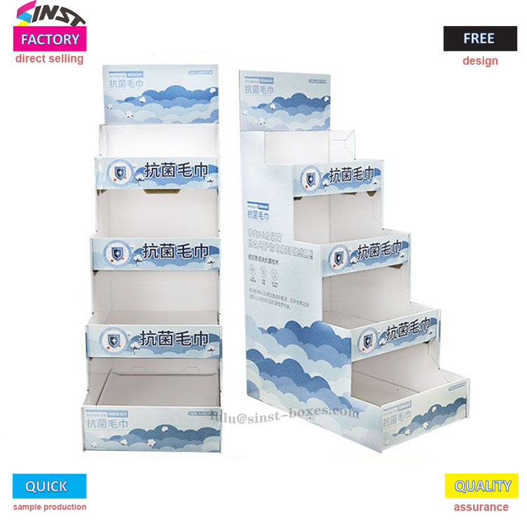 Овој дебел картонски држач за пешкири совршено ги задоволува потребите на сценаријата на потрошувачите кои брзо се движат, како што се супермаркетите, продавниците за погодности и продавниците за убавина. Скалестата структура на држачот за прикажување пешкири е како „слојна кутија за складирање“, во која може уредно да се постават крпи со различни спецификации како што се марамчиња, преносливи предмети, крпи за лице, влажни марамчиња итн., што ги прави јасни и лесни за вадење. Промотивната картичка на врвот може да биде поврзана со карактеристики како што се „потврдување на ниво на мајка и бебе“ и „мека и не пролеана“ за да им се овозможи на крпите да „зборуваат сами за себе“ на полицата.