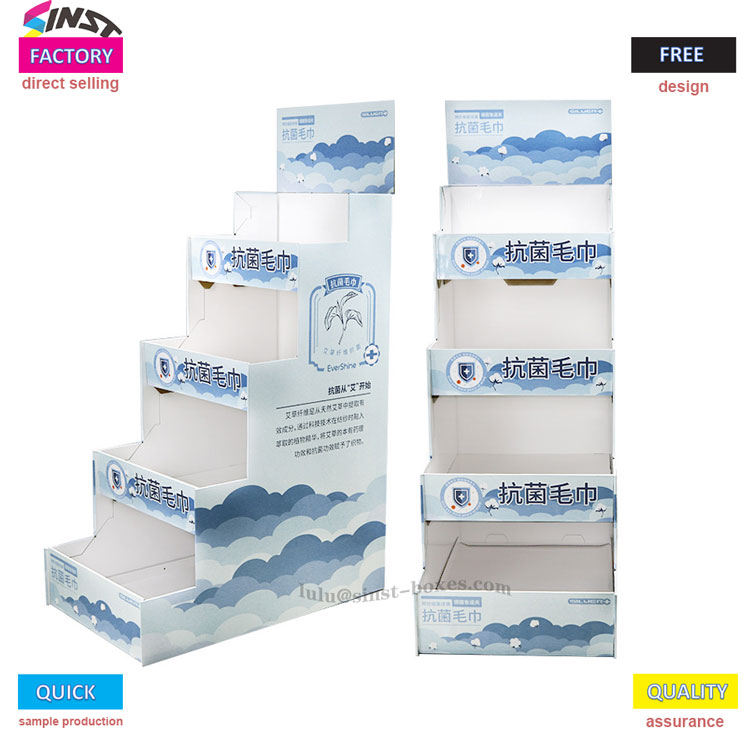 Овој држач за прикажување со пешкири од картон е специјално приспособен за категоријата пешкири, со чиста бела основа и сини и бели облаци и мали цветни отпечатоци отпечатени на него, обезбедувајќи освежувачко чувство кое совршено се совпаѓа со основните атрибути на крпите, кои се „пријателски за кожата и чисти“; Скалест трислојна структура со независен простор за складирање, што овозможува лесно сортирање и поставување на марамчиња, крпи за лице и преносни предмети за лесен пристап.